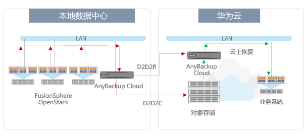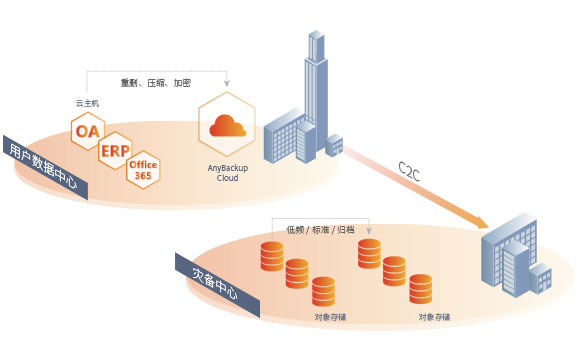用户数据中心的数据,经重删、压缩、加密后复制到灾备(自建、公有)中心。当本地发生灾难时,可通过备份系统从云存储中直接恢复数据,实现云上恢复。
