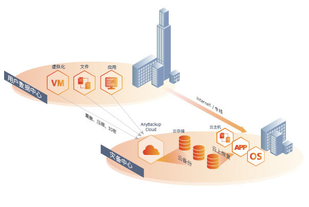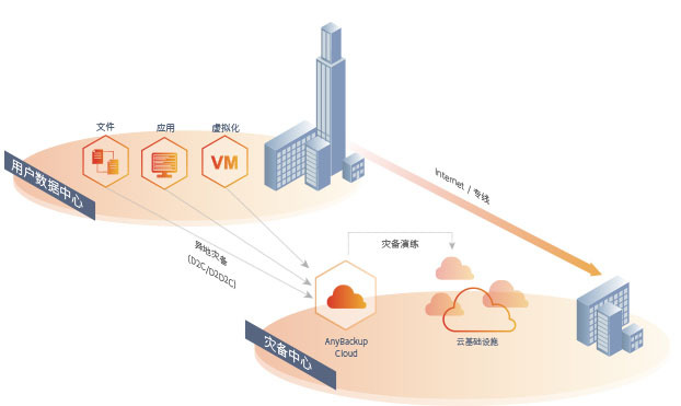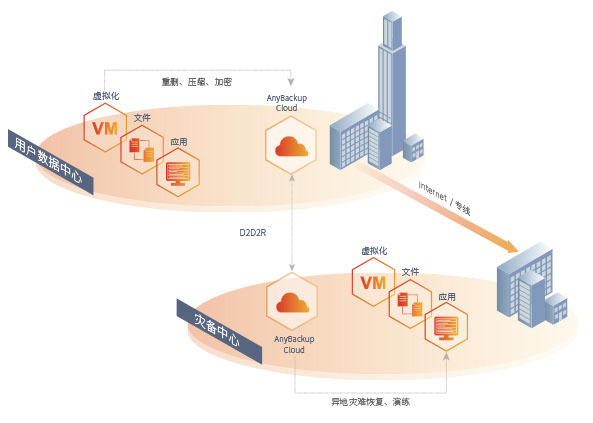 用户数据中心与专有灾备中心之间通过Internet/专线打通,本地数据通过备份系统异地灾备到专有灾备云,同时提供专有资源帮助用户进行数据灾难演练。