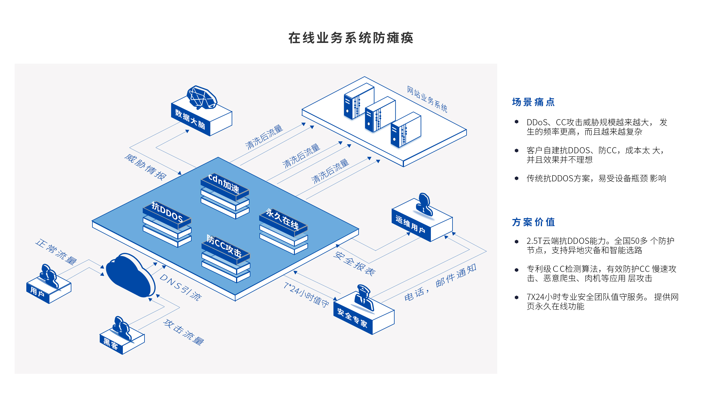 *覆盖各类Web应用攻击,专利级CC防护算法,高达 2.5T DDoS防御,网站隐身/替身*在线;智能选路CDN加速,数据大屏可视化,人机识别智能验证,一键秒级关停。