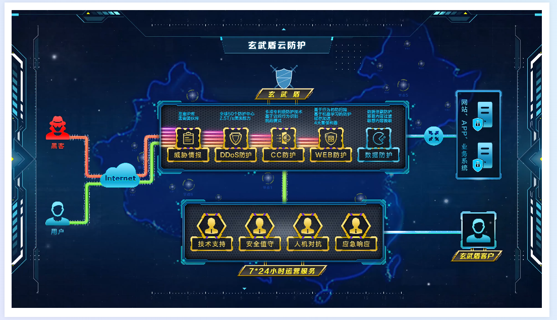 玄武盾是风暴中心自主研发的SaaS云安全防护系统,是国内首家符合等保三级要求的云防护平台。目前全国已建设50个玄武盾防护节点,能够*覆盖各类 Web 应用攻击,具备2.5T DDoS 攻击防护能力。基于零部署零运维的SaaS服务模式,10分钟即可有效接入,通过威胁情报、DDoS防护、Web防护、CC防护、数据防护5大防护模块为用户提供防攻击、防篡改、防瘫痪、防泄露等安全防护,并结合大数据流量处理,对网络安全态势进行数据大屏可视化,让安全态势可感可知。同时,40多名安全专家提供7*24小时保姆式服务,确保用户安全零损失。