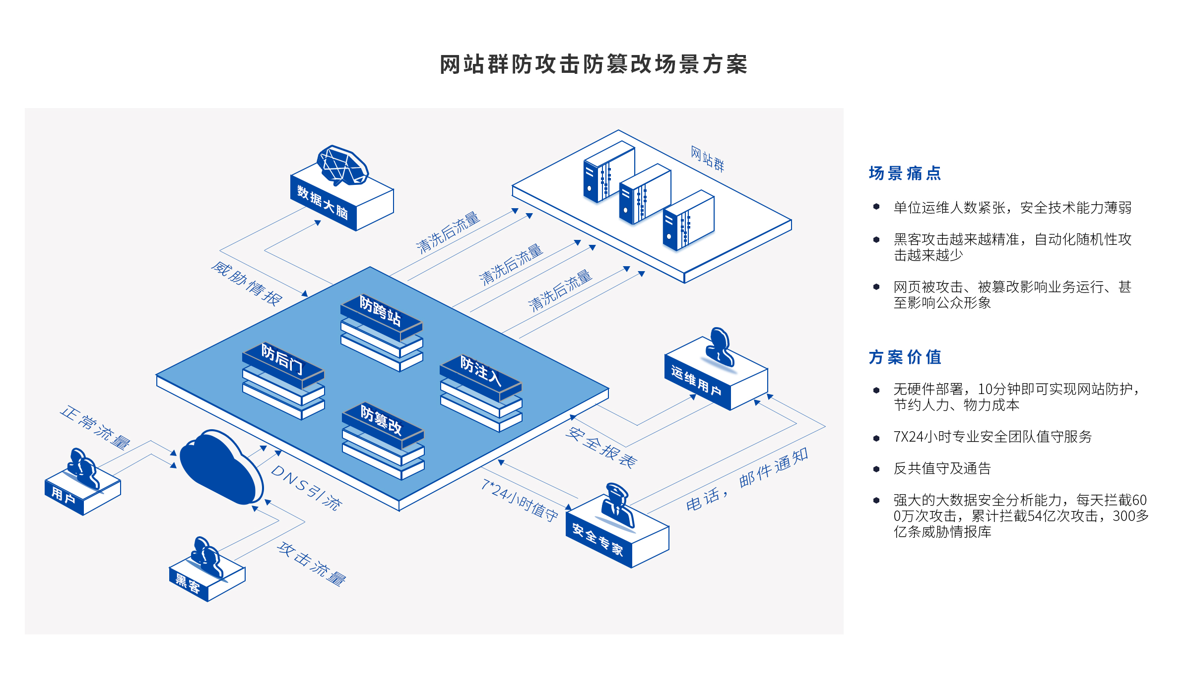 大数据流量分析,零部署零运维支持服务,*漏洞快速响应,规则库实时更新,智能行为算法有效识别持续性攻击,详细的数据报表,快速全面了解网站/APP安全状况。